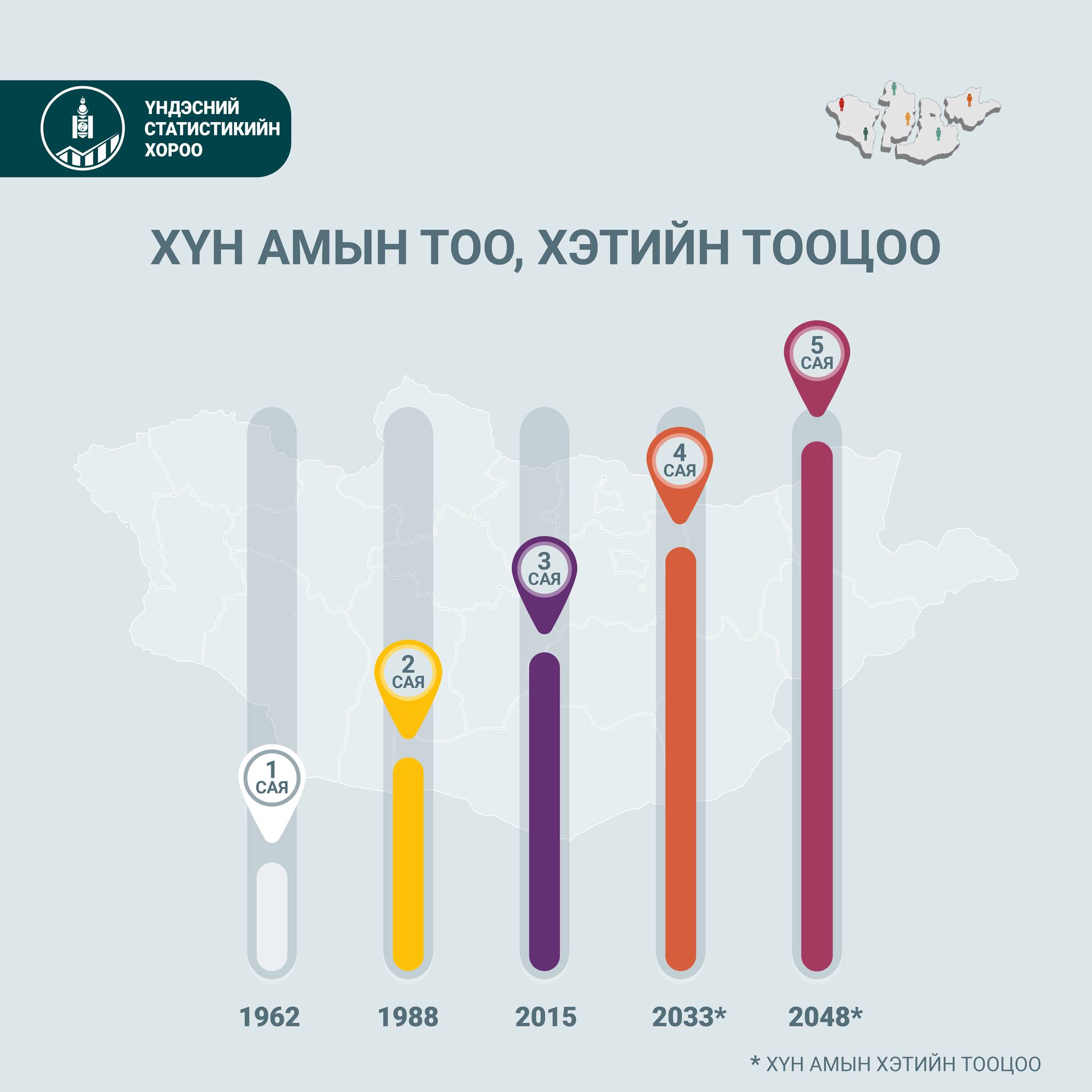 Монгол Улсын хүн ам 1962 онд 1 сая, 1988 онд 2 сая, 2015 онд 3 сая хүрч байсан.