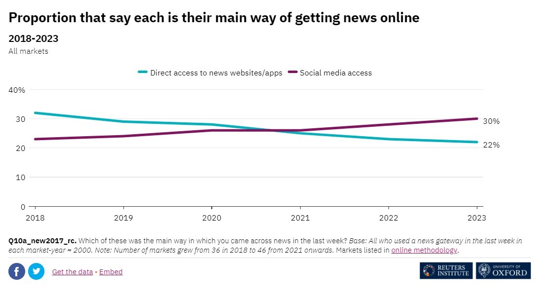 Digital News Report 2023 судалгаанд хамрагдсан 275 редакци цаашид Facebook /Meta/, Twitter /X/ руу хүч хаяхгүй, харин TikTok, Instagram, YouTube сувгууд дээр төвлөрч ажиллана хэмээн хариулсан энэ хандлагыг баталж байгаа юм.