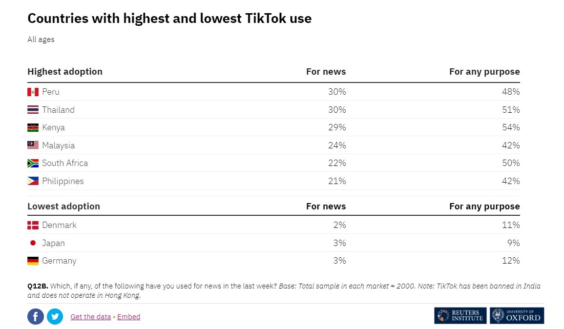 Ерөнхий дүр зургаар нь харахад хүмүүсийн зонхилон ашиглаж байгаа сошиал суваг нь Facebook хэвээр байгаа ч Facebook платформ дахь сэтгүүл зүйн контентийн хувь хэмжээ буурч, бусад суваг руу, тэр дундаа дуу, дүрс зонхилсон сувгууд руу шилжиж байна. Нэн ялангуяа You Tube болон Tik Tok суваг руу мэдээний контент шилжиж байна. Reuters Institute-ийн судалгаагаар 18-24 насныхны 44% нь Tik Tok ашиглаж байгаа бөгөөд тэдний 20% нь мэдээ үздэг гэжээ. Сүүлийн жилүүдэд Ази, Латин Америкийн зарим улс оронд Tik Tok хэрэглэгчдийн тоо тууштай нэмэгдэж байгаа юм. Тухайлбал, Перу болон Тайландад интернэт хэрэглэгчдийн 30%, Кенийн 29%, Малайзийн 24% нь хятад эзэнтэй Tik Tok сувгийг ашиглаж байна.