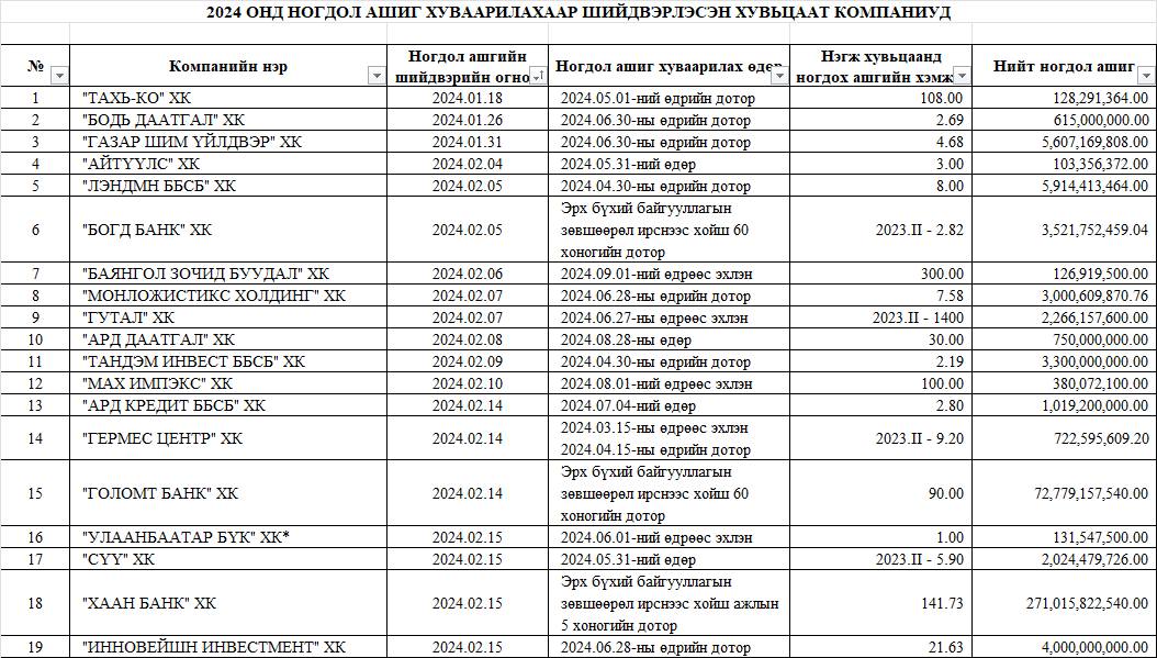 Ногдол ашиг тараах компаниудын нэрс, ногдол ашгийн хэмжээ