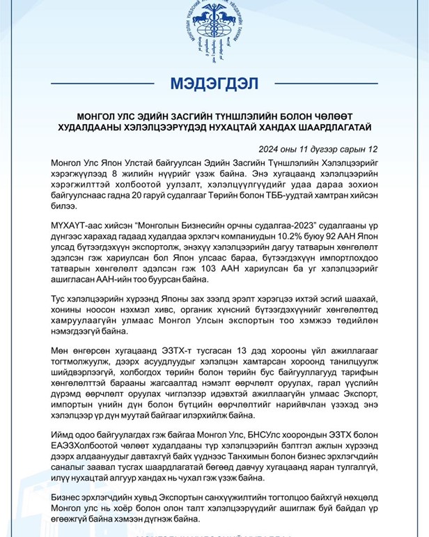 Өнгөрсөн есдүгээр сард ОХУ-ын Ерөнхийлөгч Владимир Путины Монголд хийсэн айлчлалын дараахан “Известия” сонинд өгсөн ярилцлагадаа ч гэрээг энэ 2024 ондоо багтаан ЕАЭЗХ батална гэдгийг Элчин сайд давтан хэлсэн. Энэ оны ШХАБ болон БРИКС-ийн дээд хэмжээний уулзалтад оролцсон Монголын төлөөлөгчидтэй хийсэн уулзалтуудын үеэр Оросын талаас гэрээ байгуулах ажил амжилттай явж байгааг онцолж ирсэн.