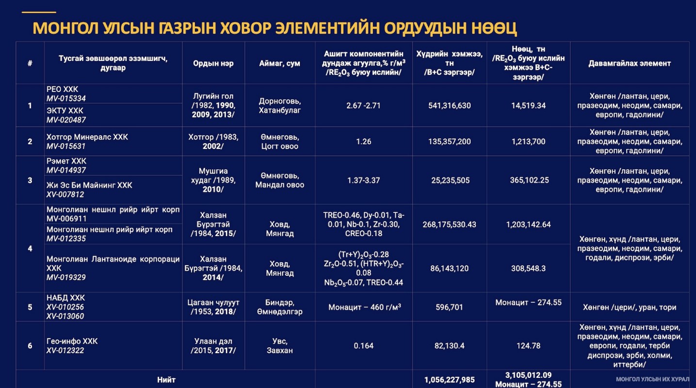 Монгол Улсын газрын ховор элементийн нэг тэрбум гаруй хүдрийн, 3.1 сая гаруй ислийн нөөцтэй хэмээн одоогоор тогтоогоод байгаа. “Халзан бүрэгтэй”-г оруулаад нийт 6 тусгай зөвшөөрөл олгогдсон. Тухайлбал,