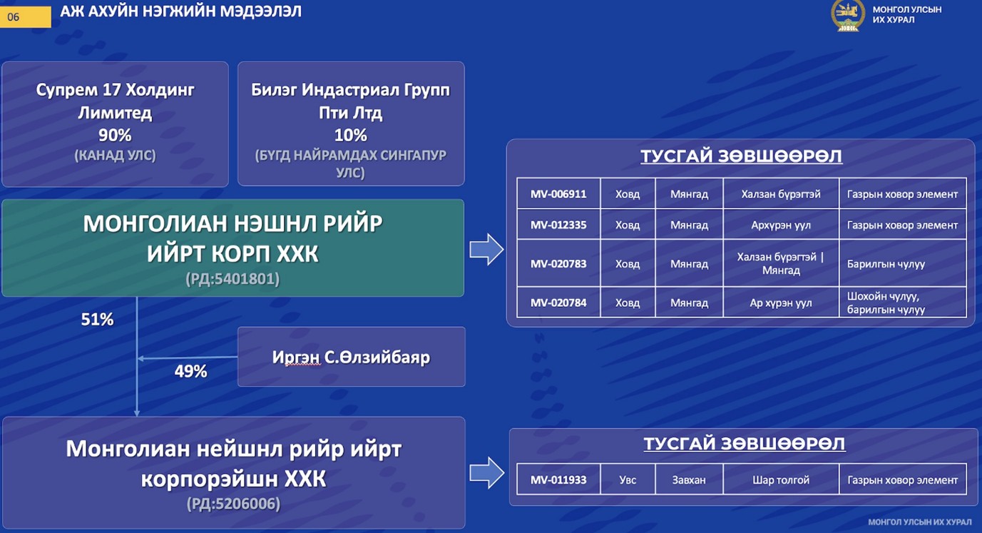 Өдгөө “Халзан бүрэгтэй” ордод ашиглалтын 4 тусгай зөвшөөрөл эзэмшигч нь “Монголиан нэшнл Рий Ийрт Корп”. Тус компанийн 90 хувийг нь Канадын “Супрем 17 Холдинг Лимитед” ХХК, 10 хувийг нь Сингапур Улсын “Билэг Индастриал Групп Пти Лтд” ХХК эзэмшдэг.