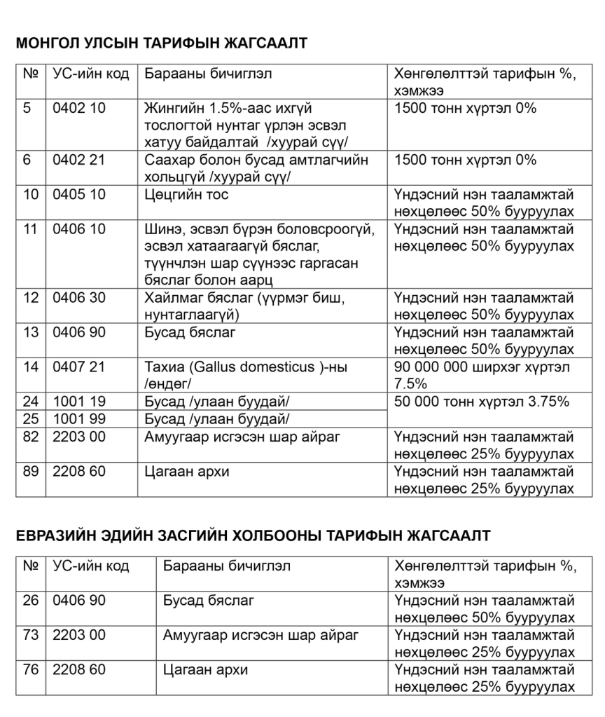 Монгол Улс болон ЕАЭЗХ, түүний гишүүн орнууд хоорондын худалдааны түр хэлэлцээрийн хүрээнд квоттой болон хөнгөлөлттэй тарифтай барааны жагсаалт